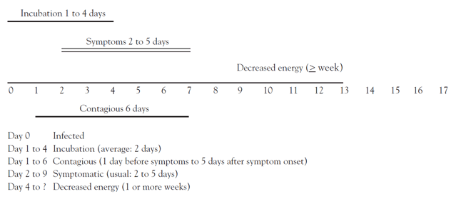 Click to ReviewInfluenza is highly contagious, with an attack rate of 10% to 20% from the day before symptoms begin through approximately five days after onset in adults. It is spread from person to person through coughing and sneezing by the infected individual. Influenza is spread by the airborne route, which means that a person coughing in the room can transmit the virus to others in the room without close personal contact. This is in contrast to droplet transmission in which heavier particles (droplets) are transmitted to those with close contact (less than 3–6 feet, depending on the organism). Droplet transmission also probably occurs in influenza. Airborne transmission is especially significant in congregate situations like institutions, daycare facilities, airplanes, and cruise ships [17].