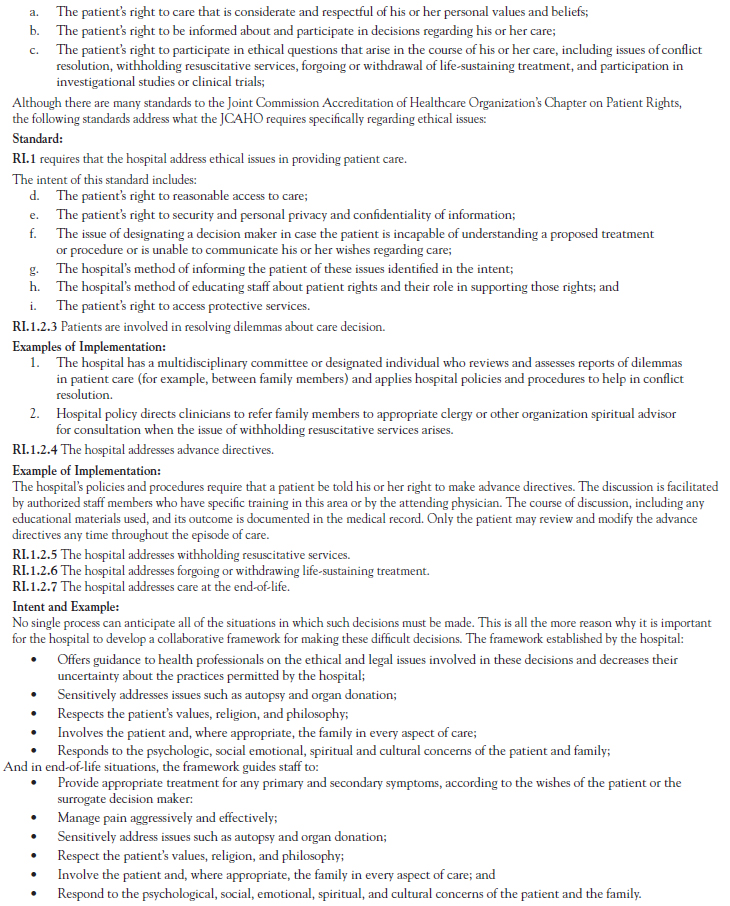 If any of these situations warrant immediate results (e.g., the patient is facing imminent death), the conflict should immediately be reported to the primary physician and/or administrator charged with the final determination of action in ethical matters (e.g., Chief of Medical Staff for physician issues, Institutional Ethics Committee Chairperson or members, Risk Manager). Healthcare team members should always keep in mind that if the patient is competent and able to speak, the patient has the right to accept or refuse care, and his or her wishes are protected by state statutes and hospital policies that address these rights.