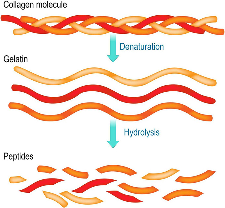 Collagen peptides are created by enzymatic degradation of gelatin, via use of specific proteinases (Figure 1). This produces shorter peptides with an average size of 3.3 kilodaltons. Unlike gelatin, collagen peptides are soluble in water and do not form a gel [1]. Collagen peptides, which are also commonly referred to as hydrolyzed collagen or collagen hydrolysate, comprise the majority of collagen supplement products available on the market.