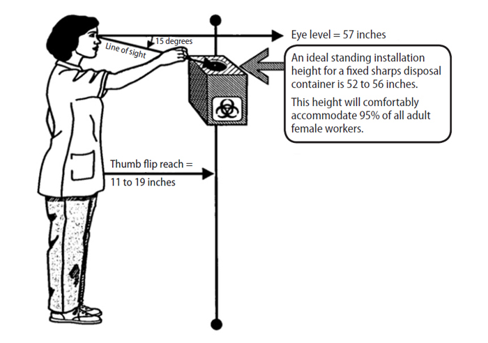Most nurses are women, and a sharps container for a standing workstation placed between 52–56 inches from the floor will accommodate 95% of female nurses (Figure 1) [27,28]. For seated workstations, the preferred height is 38–42 inches. Taller healthcare practitioners will also be able to comfortably and safely use containers placed at these heights.